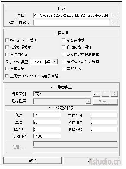 Direct Wave - 选项打开选项窗口 - 鼠标左击峰值音量表上方的‘选项’按钮。选项对话框用来选择浏览目录,转换品质和设置自动化 VST 采样。 目录目录库 - 指定采样库。这也是保存 DWP 文件和采样数据时的默认目录。 VST 插件路径 - 指定 VST 插件目录。 全局选项64-点 Sinc 引擎(高品质) - 设置回放引擎为高品质插值模式(可限带宽 sinc 插值)。 完全恢复模式 - 波形数据与工程文件进行捆绑。注意:这样会使创建的工程文件很大,但非常有利于其它用户或在别的电脑上无需采样数据而使用这个工程。默认下完全恢复被禁用,只有波形文件的引用名称保存到工程中。 文件浏览器 - 开启集成的浏览器。 多音色模式 - 允许 Direct Wave 独立响应全部 16 条 MIDI 通道(仅 VST)。 峰值规格化波形采样 - 最大化波形采样的音量,使峰值达到 100% 音量。这个效果用来平衡采样的最大音量。 从文件名中提取根键 - 采样根键将来自于文件名称,例如 C4Strings.WAV 将设置根键为 C4 。 VST 乐器宿主当前实例 - 为了进行采样,使 Direct Wave 成为 VST 乐器的宿主。 选择程序 - 选择程序来采样。 VST 乐器采样器设置自动化采样选项。请注意,很长的采样如果设置的力度分层太多,键步长太小,其结果会导致程序变得很大。 低键 - 采样最低键。 高键 - 采样最高键。 键步长 - 从最低音符开始键编号的步进长度。 力度拆分 - 对采样力度分层进行编号。 程序编号 - 当自动采样 VSTi 插件时,你可以仅转换当前程序(设置为‘1’),或转换指定编号的程序。例如,程序编号设置为 16 将转换 16 号程序到目录库中。VST 乐器具有不同的程序编号,最高达 128。在 VST 乐器中的程序和预置是一回事。 长度(秒) - 采样持续时间。 处理 - 开始自动采样。 |