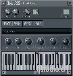 Fruit Kick 是一个简单的底鼓合成器。底鼓声音由简单的正弦波波形合成,并具有一个快速打开音量包络和一个快速降落初始音高,并且允许调整这些参数。