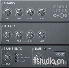 立体声分离度旋钮(PAN) - 向右旋转的越多,则越多的奇数颗粒向右平移,越多的偶数颗粒向左平移。要禁用这个效果,旋转旋钮到最左侧。 效果深度旋钮(FX.D) - 这个设置确定应用到波形间距值的 LFO 的振幅。向右旋转来增大振幅。要关闭 LFO ,旋转到最左侧。 效果速度旋钮(FX.S) - 这个旋钮确定应用到波形间距值的 LFO 的速度。向右旋转使 LFO 加速,向右旋转则减速。 随机旋钮(RAND) - 随机回放颗粒。向右旋转旋钮增大效果。要禁用效果,旋转到最左侧。 瞬态部分(TRANSIENTS)