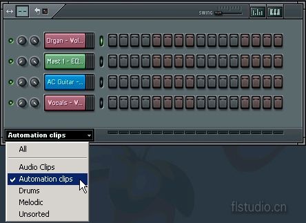 此处有两种模式,选中左边波形按钮(Audio Clips)就是以前的模式,可以用鼠标拖动音频波形块的位置。选中右边的包络自动化控制按钮(Automation Clips)就是新的自动化控制模式。