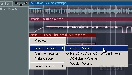 在Automation Clips窗口中,单击一下鼠标就会出现一个新的Automation块,我们还要单击名称前的小问号,选择Select Channel中相应的参数,比如我刚才建立的第5通道的音量参数(Organ-Volume),如下图。