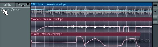 PlayList窗口中,音频音轨部分的声音波形以前是无法通过包络线进行音量、声像等控制的,FL Studio 5加入了这个功能,如下图。