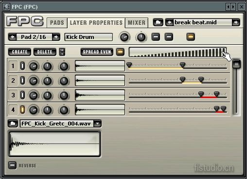 不同音色在不同力度值下通常激发不同的采样,这样可以得到更加逼真的效果。例如上图的底鼓分成4个力度层,通过横向的推子控制不同力度触发的采样,力度分层也可以重叠同时触发多个采样。REVERSE按钮可使当前采样反向,这在舞曲的打击乐中也是常用的。