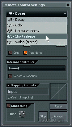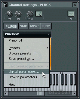 多媒体键盘的功能键现在不仅可以在听CD时使用了,也可以用来控制水果。 连接所有参数到控制器: 所有插件和效果器都可连接所有参数到MIDI控制器,这样省得挨个旋钮的去MIDI Learn了。 选择“连接所有参数到MIDI控制器”之后,弹出界面和以前MIDI Learn唯一的不同就是窗口最上面可以选择该插件所有可控制的参数,依次选择并进行MIDI Learn,就可以快速把每个参数都和MIDI控制器连接上。
