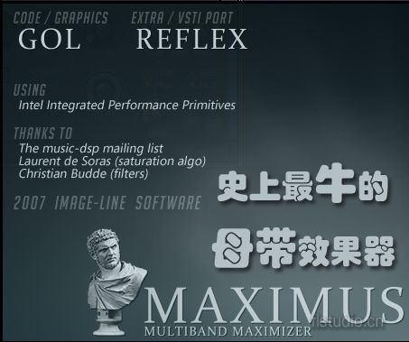Lock spare state:防止官方预制参数被修改,打上钩吧~ Oversample:超采样,使用更高的内部采样精度算法,但也会加重CPU的负担,拿我的机器来说(AMD 4400+双核、2G DDR800内存),大概会增加10%的CPU占用率。 Master mid mode:bypass掉低频/高频的整个压缩模块,仅以中频去驱动Master的压缩模块(与下文的COMP OFF功能不同,下文会讲),这时各段EQ模块还起作用,因此你可以通过调节中频来达到控制MASTER的目的,也就是Side Chain常见的功能了。另外可以达到Gate和De-Esser的效果。 Linear-phase filters:线性相位切换,一般的滤波器(EQ)中我们可以看到两种滤波模式:IIR和FIR,FL 7中Multiband Compressor的面板就有这两种模式选择。其中IIR精度高,音质好但相位信息差;FIR相位准确,省资源但精度低,可以说这两种模式各有所长,根据自己的情况选择。Maximus中默认就是用FIR(非线性相位)Linear-phase选项可以切换到IIR模式,这对CPU也有一定的占用,我的机器上大概3%左右。 About:“专门用来眩模式”…还有相关的介绍和说明:Maximus程序员是GOL和Reflex,还有在插件列表中Bypass掉Maximus也能进入眩模式。