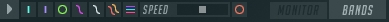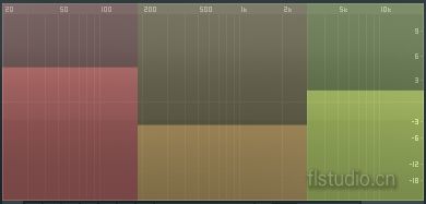 最后,该压缩包络窗其实并不是一个压缩器而已,而是四个(等下会谈到),可以对高中低频与总输出制定不同的压缩包络。 二、频谱仪 频谱仪共有三种模式:电平/增益包络模式MONITOR、EQ/频谱模式BANDS、还有“专门用来眩模式”,先来看工具条: