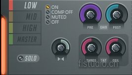 三、压缩参数选项窗 可以调节低/中/高频和MASTER的压缩参数,每段都带有五种监听模式,ON和SOLO不用说了,其他三项: COMP OFF:关闭压缩,与上文的Master MID mod不同,此时的POST、立体声分离、THRES和CEIL还起作用。
