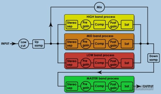 六、结语 最后还跟我常用的L3对比了一下,由于L3单纯只有压限功能,就显得比较挑剔了,在做一些本来响度就很大的舞曲时力不从心(看起来没爆,听着已经爆了),而Maximus的优势就在于这里,响度大的可以调节压缩、响度小的音量均等的可以将PEAK模式切换成RMS模式,想要原始的“模拟味”可以将电子管模拟切换成B模式,想要干净的数码味可以切换为A模式。附以极其详细的频谱仪,可以对各项母带参数了解得一目了然。 音质方面,没有一个办法进行量化测试,但从主观听感来说,非常通透,绝对比T-racks和臭氧要优越(要打开前文中的高精度选项和IIR),和Ozone比起来的话…有些像大众汽车和丰田的区别??粗放的大众追求大气和动力;而细心的丰田讲求实用、服务和环保。总之各有特色,虽然可能有些不习惯,但我以后可能会将L3换成Maximus,感觉Maximus更适合于数码时代的音乐特色,是纯粹从数码音乐制作的角度来考虑的,而不是像其他插件一样光模仿Analog时代的硬件。 通过以上的介绍让我们认识到了Maximus这款极为强大又极度细心的插件,即使作为纯粹的第三方母带软件也是非常优秀的。价格上,L3-16不单卖、Ozone3是$249,Maximus本月促销卖$119,优势也不用多说,它与最新的Synthmarker可编程模块合成器估计会成为FL8的最大亮点。从最近的FL studio 7.3的情况来看,还有Playlist和录音上的重大更新,加上最新的发布的巨无霸音色Varazdin…期待Imageline会带给我们更多的惊喜。 最后附上Maximus的信号流程图: